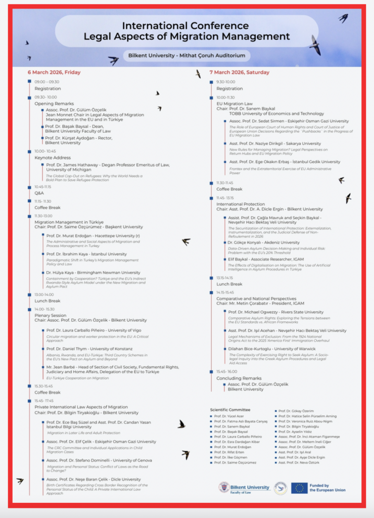 Bilkent University Faculty of Law and the Jean Monnet Chair in Legal Aspects of Migration Management in the EU and in Türkiye present the International Conference on Legal Aspects of Migration Management to be held at Bilkent University, Mithat Çoruh Auditorium on 6–7 March 2026.